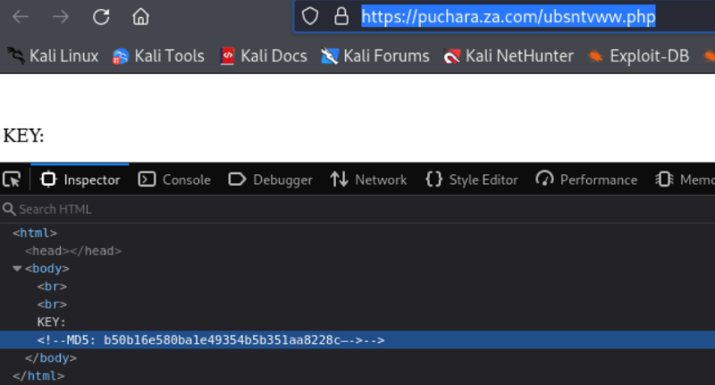 ubsntvww.phppage hosts an MD5 hashed key. My presumption is that this is related togytowpcr.php, but I wasn’t able to trivially crack the hash.