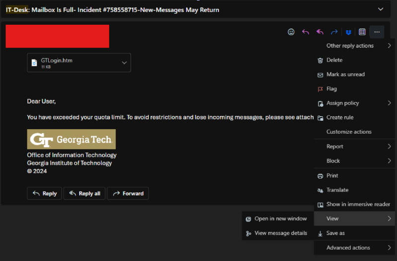 At-a-glance, the attached file (GTLogin.htm) was a clone of the Georgia Tech login page: