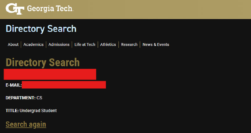 My last check was to validate the student’s listed ID. Georgia Tech provides a directory (https://directory.gatech.edu/) that you can use to look up students and staff. The email showed the senders full name, so it was trivial to validate that they existed (and that their email ID matched):