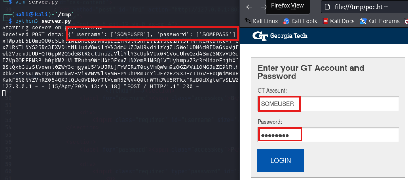 In essence, this is a look-a-like page designed to social engineer GaTech usernames/passwords, submitting that data to a malicious website for collection and follow-on action. To demonstrate, we can trivially spin-up a python HTTP server: